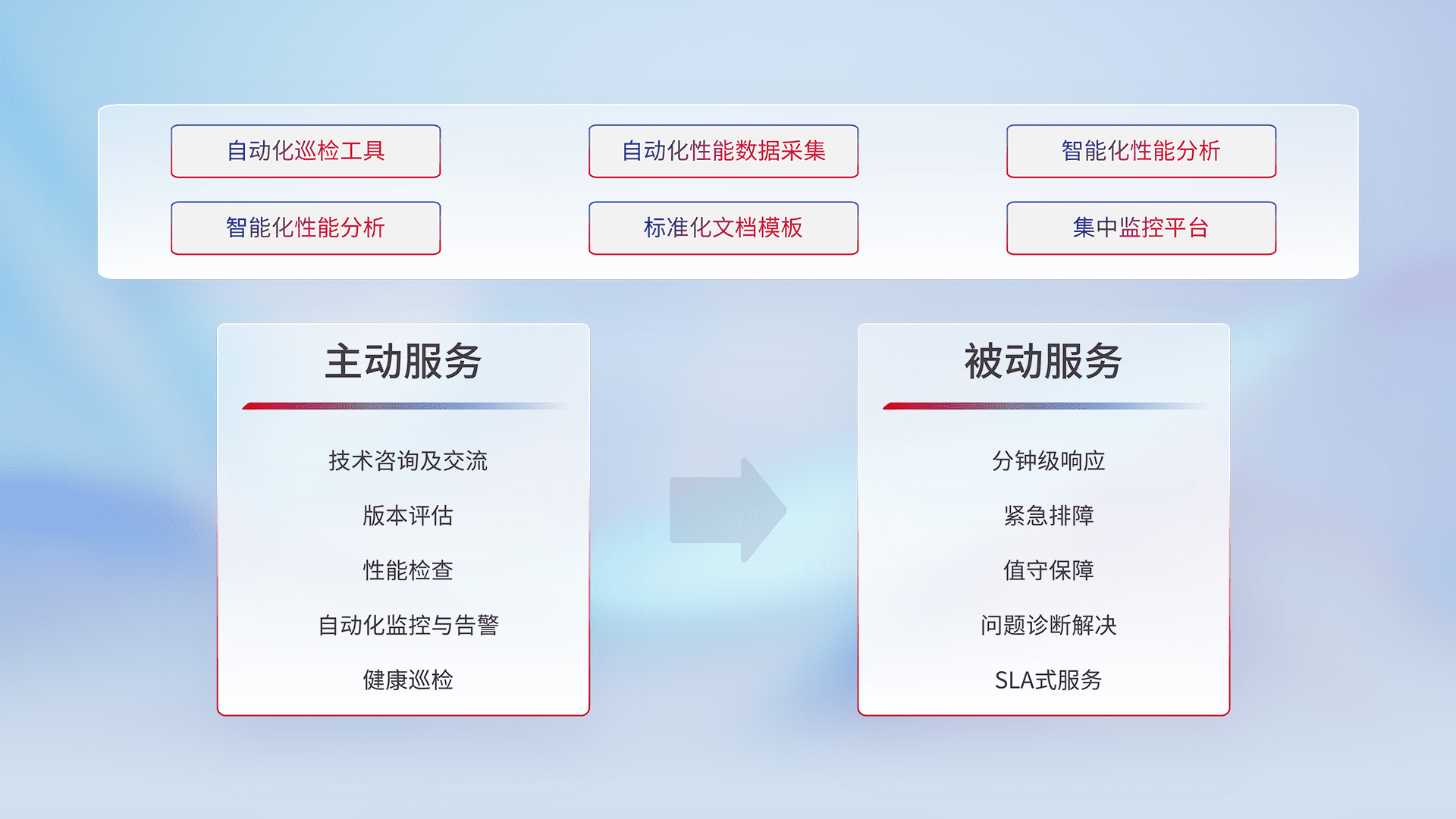 智能化工具和标准化文档,,保障服务质量,,,提供主动服务(包含技术咨询、、、、版本评估、、、性能检查、、、、自动化监控与告警、、、健康巡检)和被动服务包含(分钟级响应、、紧急排障、、值守保障、、、、问题诊断解决、、SLA服务)。。。。